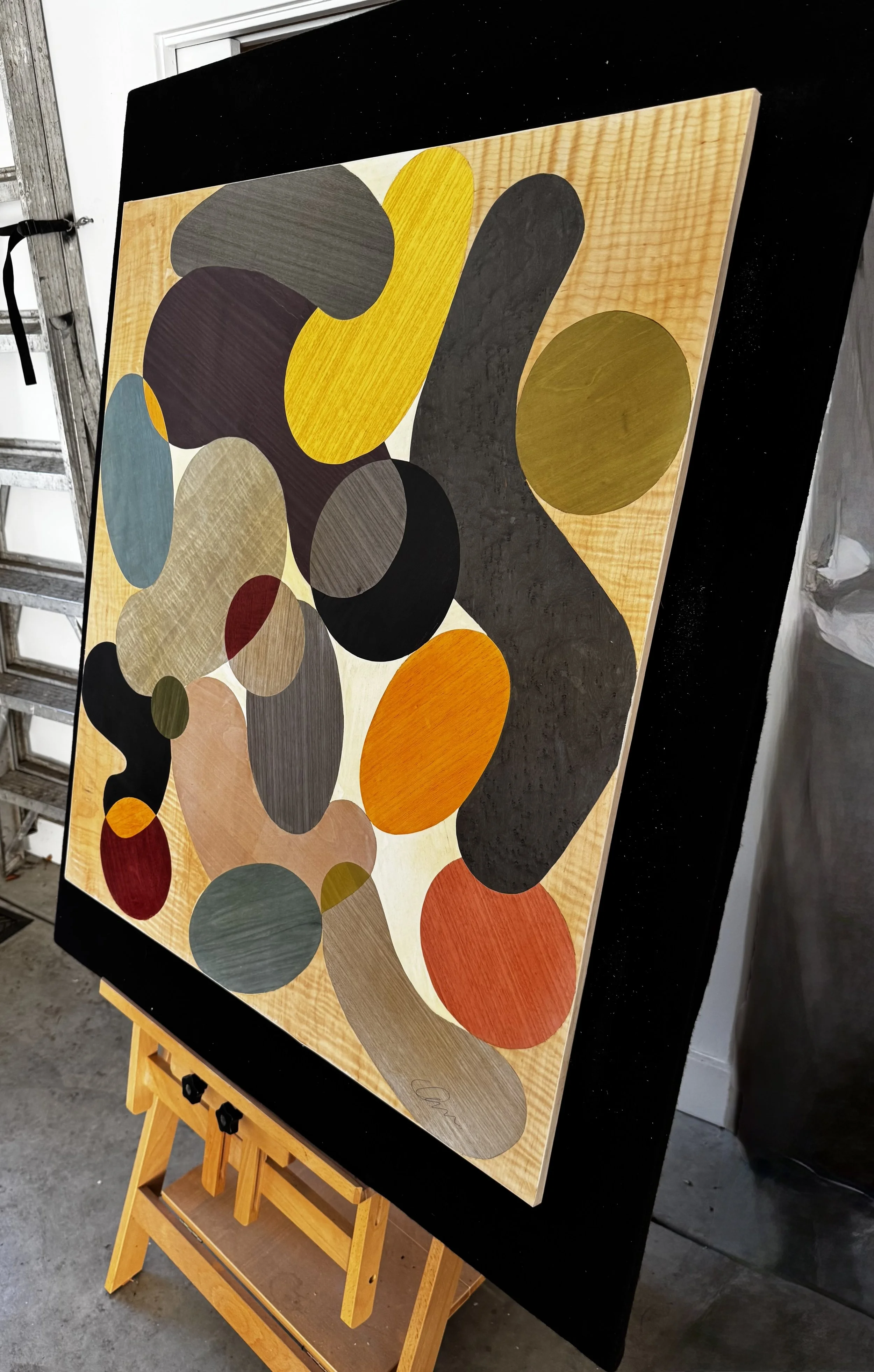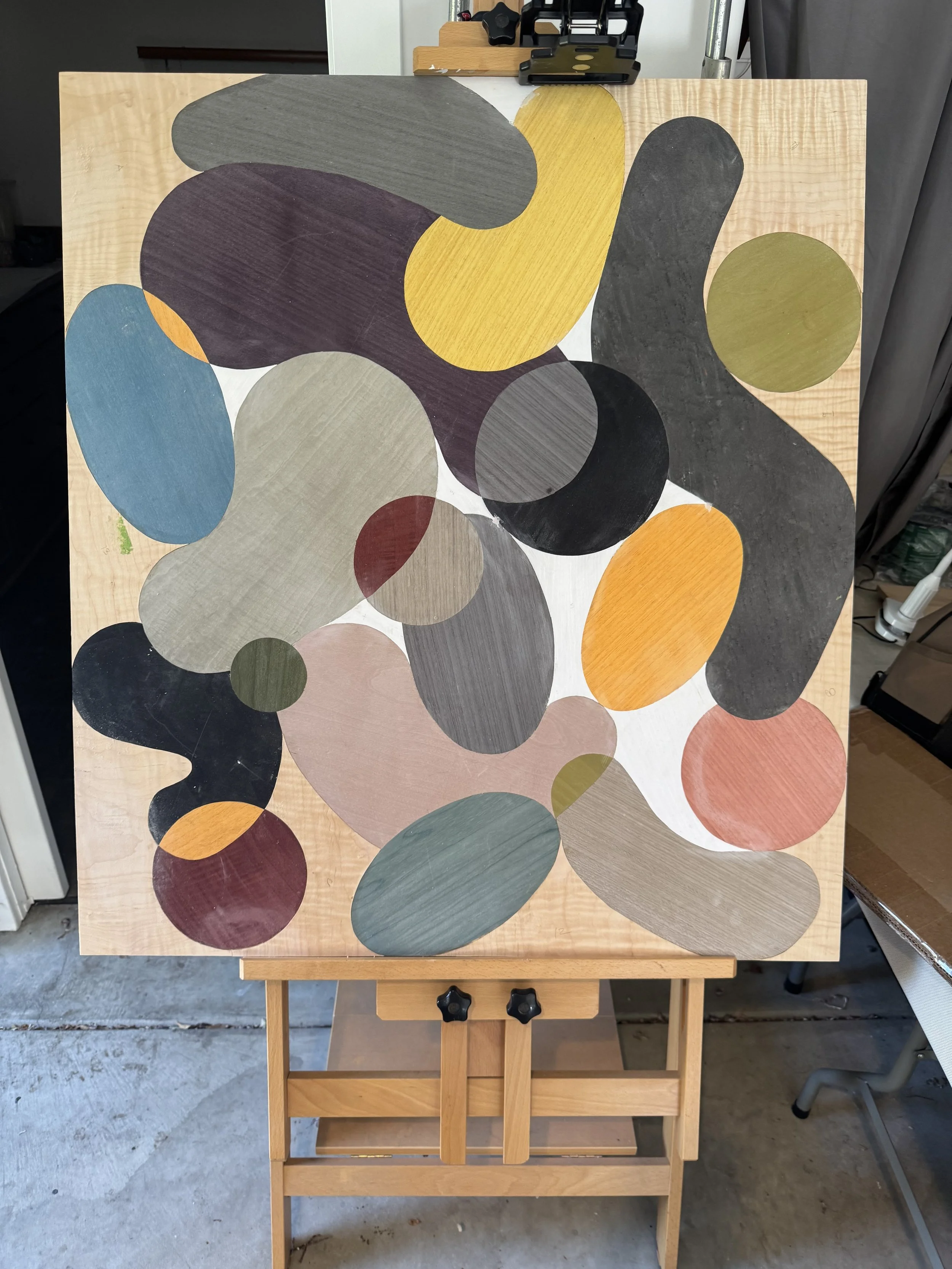 I work with figured and dyed wood veneers, using color, shape, and grain to create movement and tension between living amorphic shapes that generate stress through space and form. The work's surface is two-dimensional, with no depth or three-dimensional elements. Forms push and pull against each other; each struggling against the other to define their shape, the space they inhabit, and create tensions, pressures, and influences on the dynamics of their environment. Form and movement define relationships and dependencies as they struggle for existence within a constrained area.